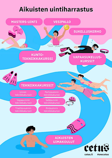 Cetus järjestää uintikursseja aikuisille eri uimataidon tasoilla, jotta jokainen voi kehittää taitojaan vedessä sopivalla haastavuustasolla. Aikuisten uintikurssit löydät tämän sivun sivuvalikosta.